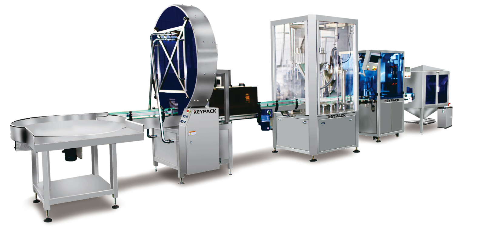 應用于各種粉末、顆粒類產品的自動計量、灌裝、封口、貼標、打碼等自動化生產線,按照常規(guī)聽裝流程配置,整個生產過程自動化程度高。
